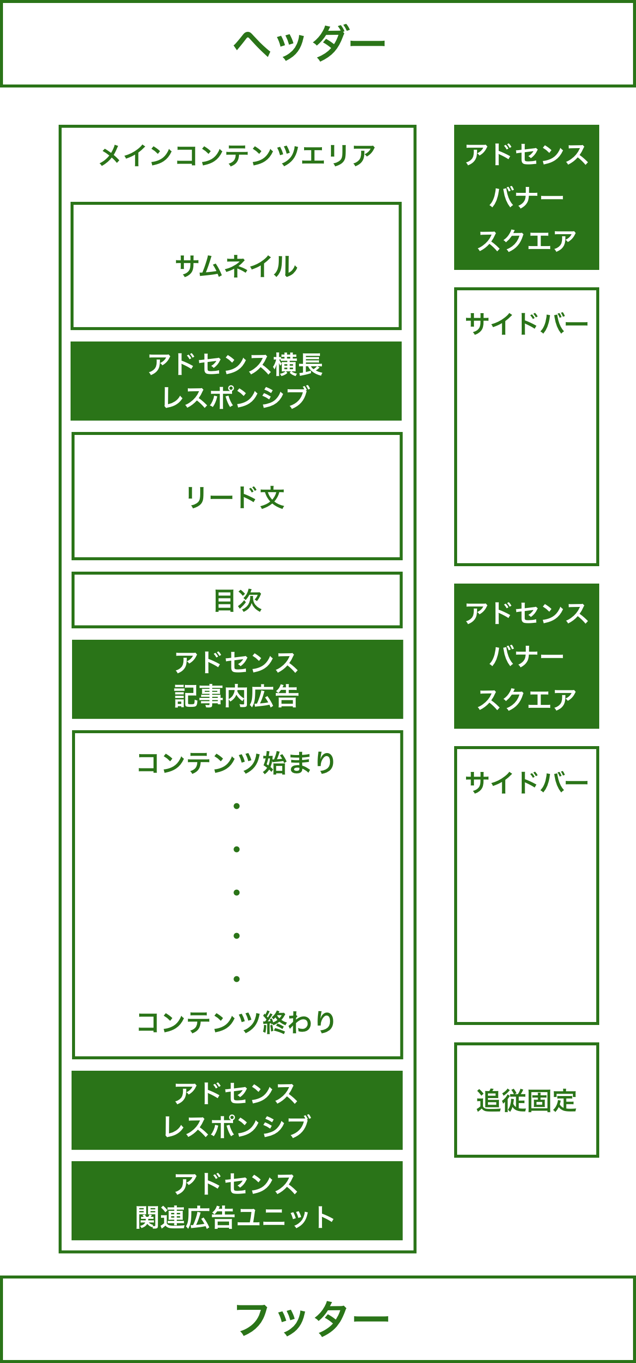 緑色で塗りつぶされているところがGoogleアドセンスです。文字にすると