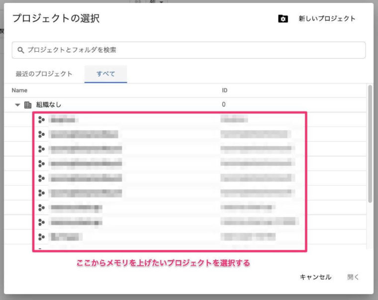 その後出てくる、↑の画面で「すべて」のタブをクリックして、メモリを上げたいプロジェクトを選択します。