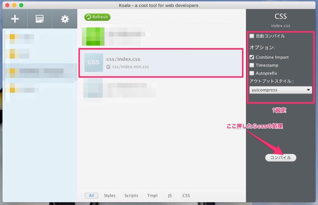 Koalaにプロジェクト追加して、Cssを選ぶ。すると右側にメニューがあるので、設定して、「コンパイル」をクリックすれば、css圧縮やソース整形などの処理が行われます。