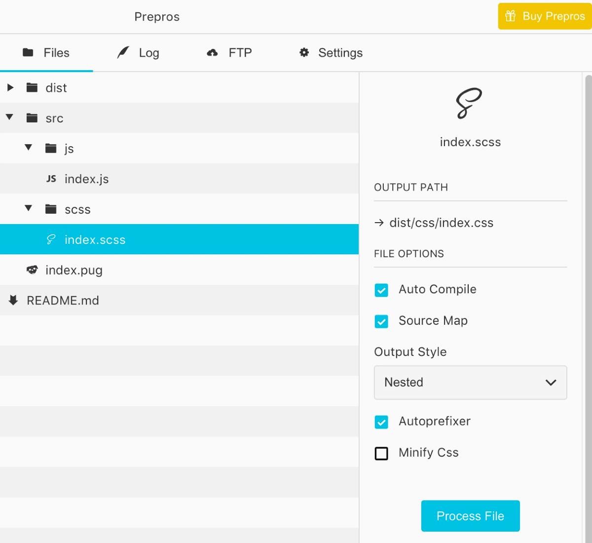 その後、SassやPugファイルをPrepros内で選ぶと詳細設定が可能。