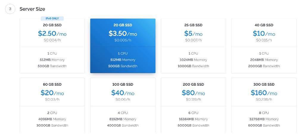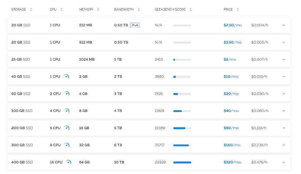 Vultrは安いだけでなく、より性能が高いプランが上に8個あり、全部で9段階のプランから好きなものを選べます。