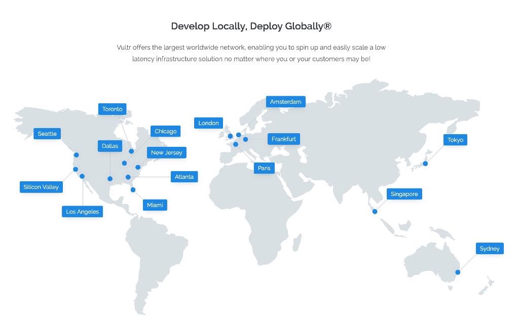 Vultrは世界最大規模のネットワークを提供しているため、あなたやあなたの顧客がどこにいようとも、低レイテンシのインフラストラクチャソリューションを簡単に拡張できます。