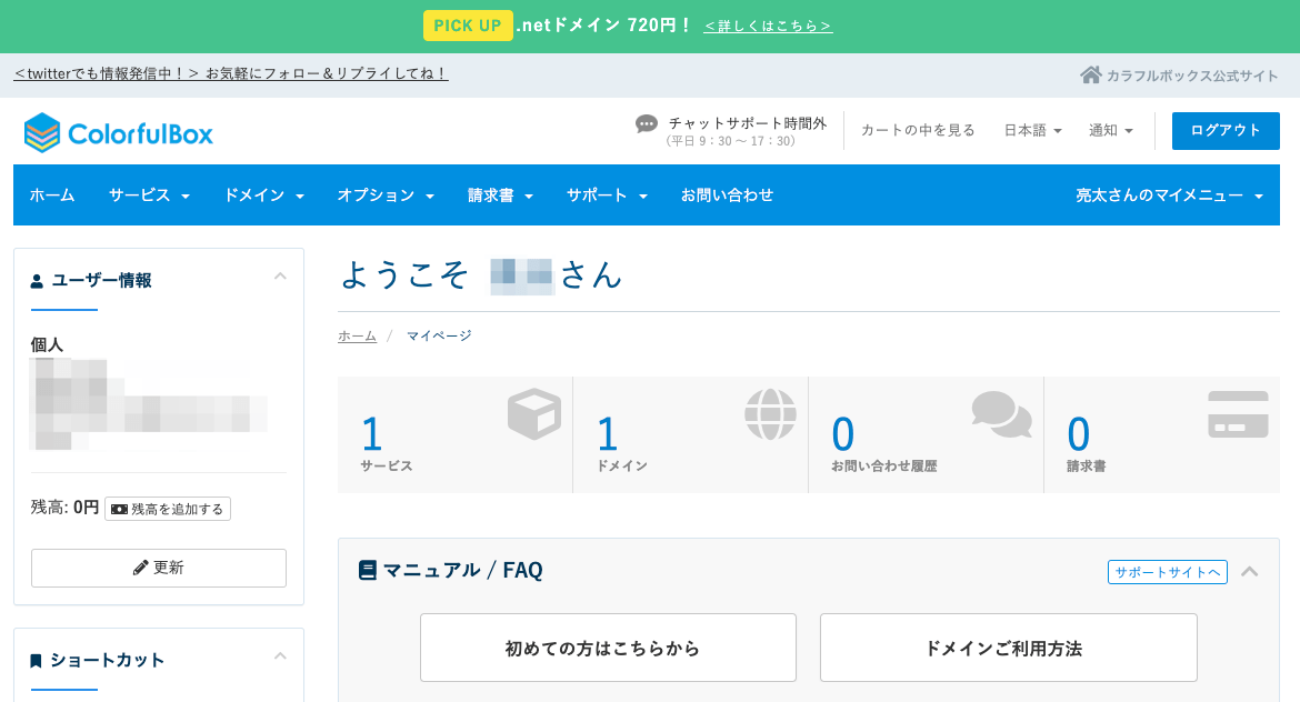 契約してログインするとこんな管理画面に入れます。ここから、サーバーの管理画面やドメインの設定ができます。(カラフルボックス単体でドメインの購入ができるのでドメインの設定もできる)